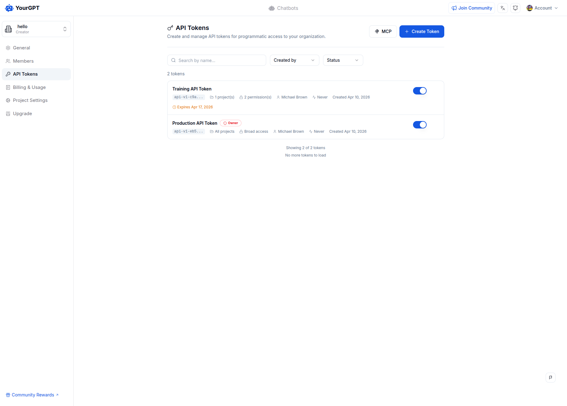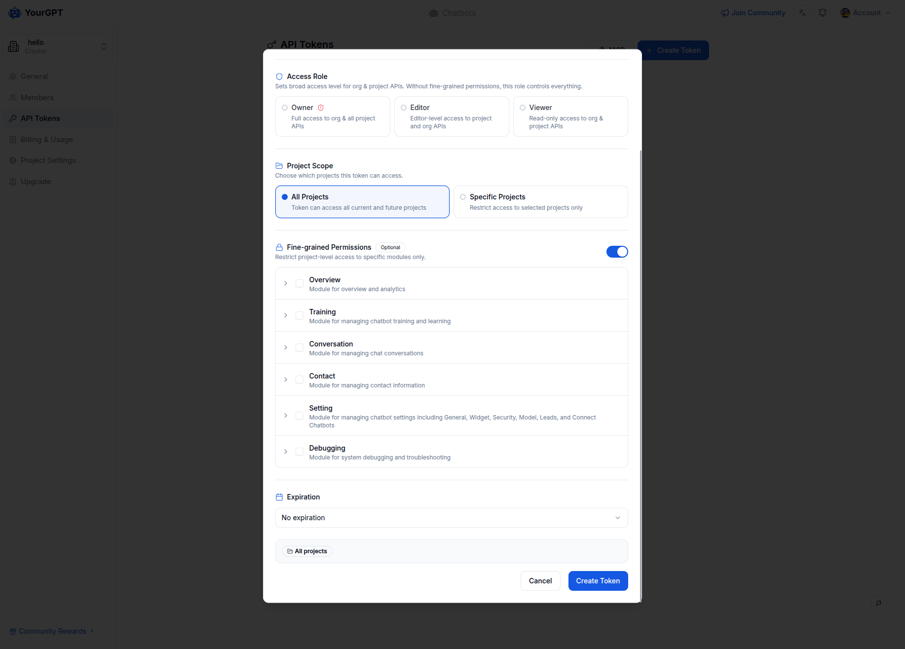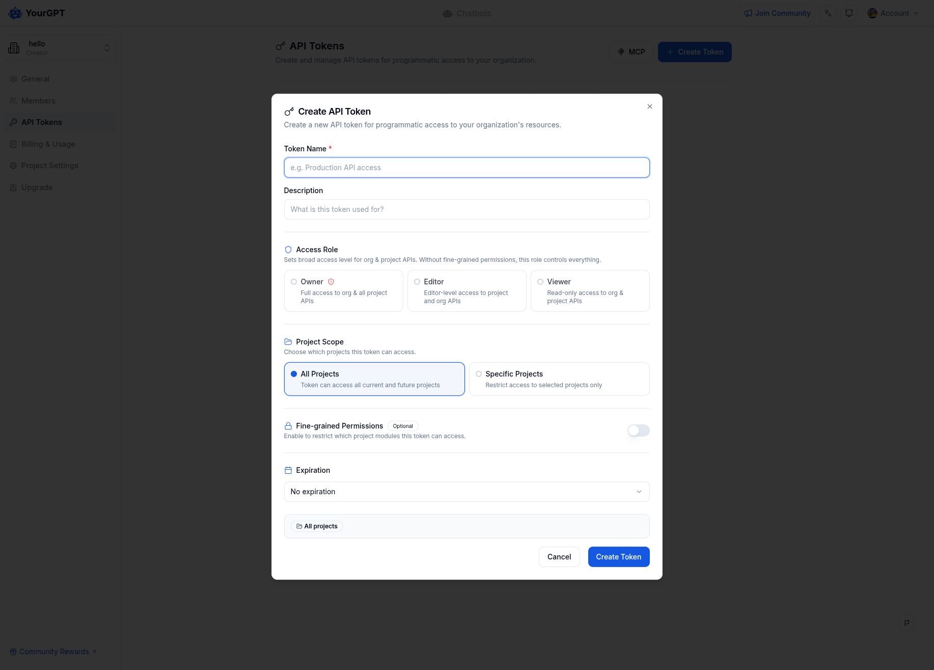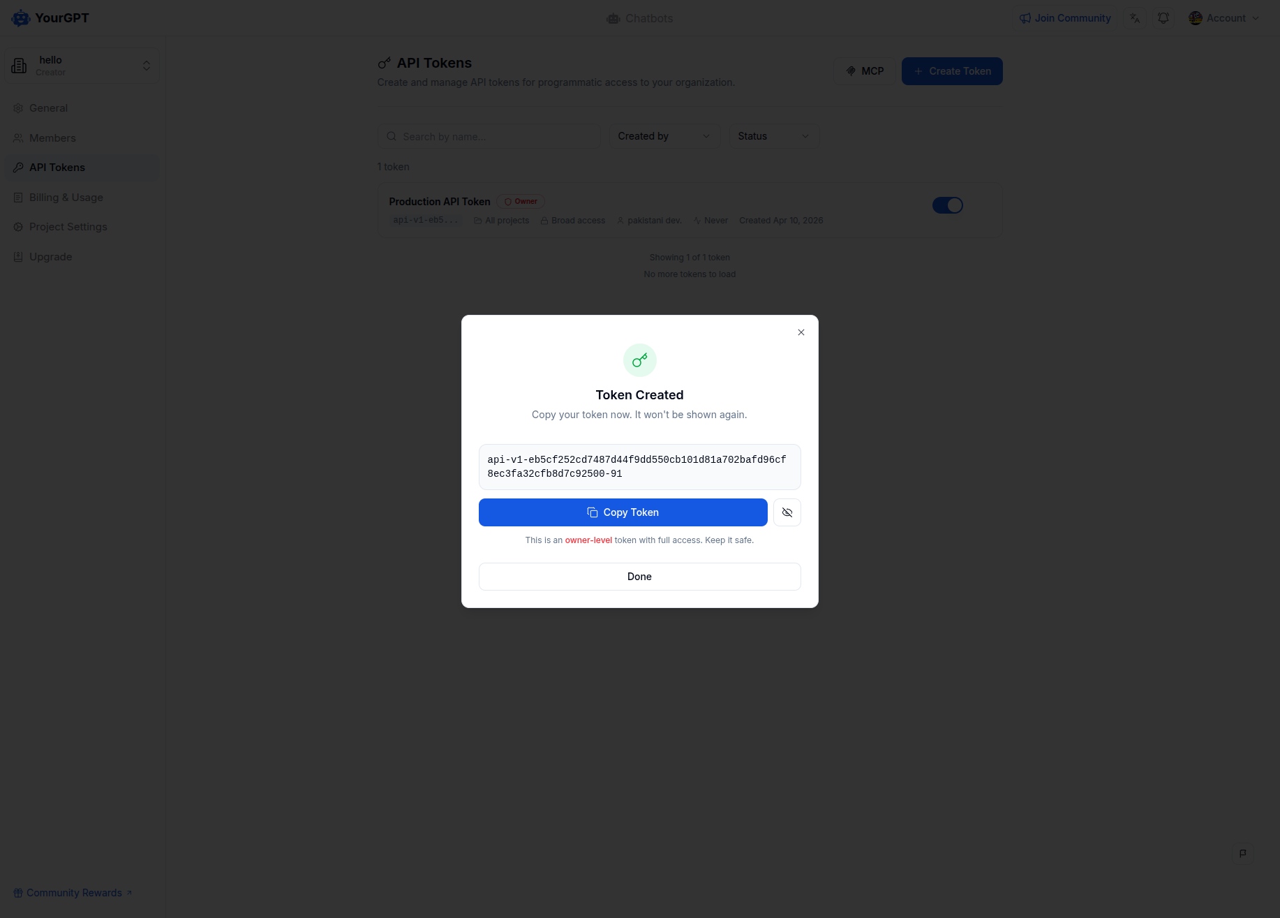 Every request requires a Bearer token in the Authorization header. You create tokens from your YourGPT dashboard — each token is scoped to an organization and can be restricted to specific projects and permissions.
