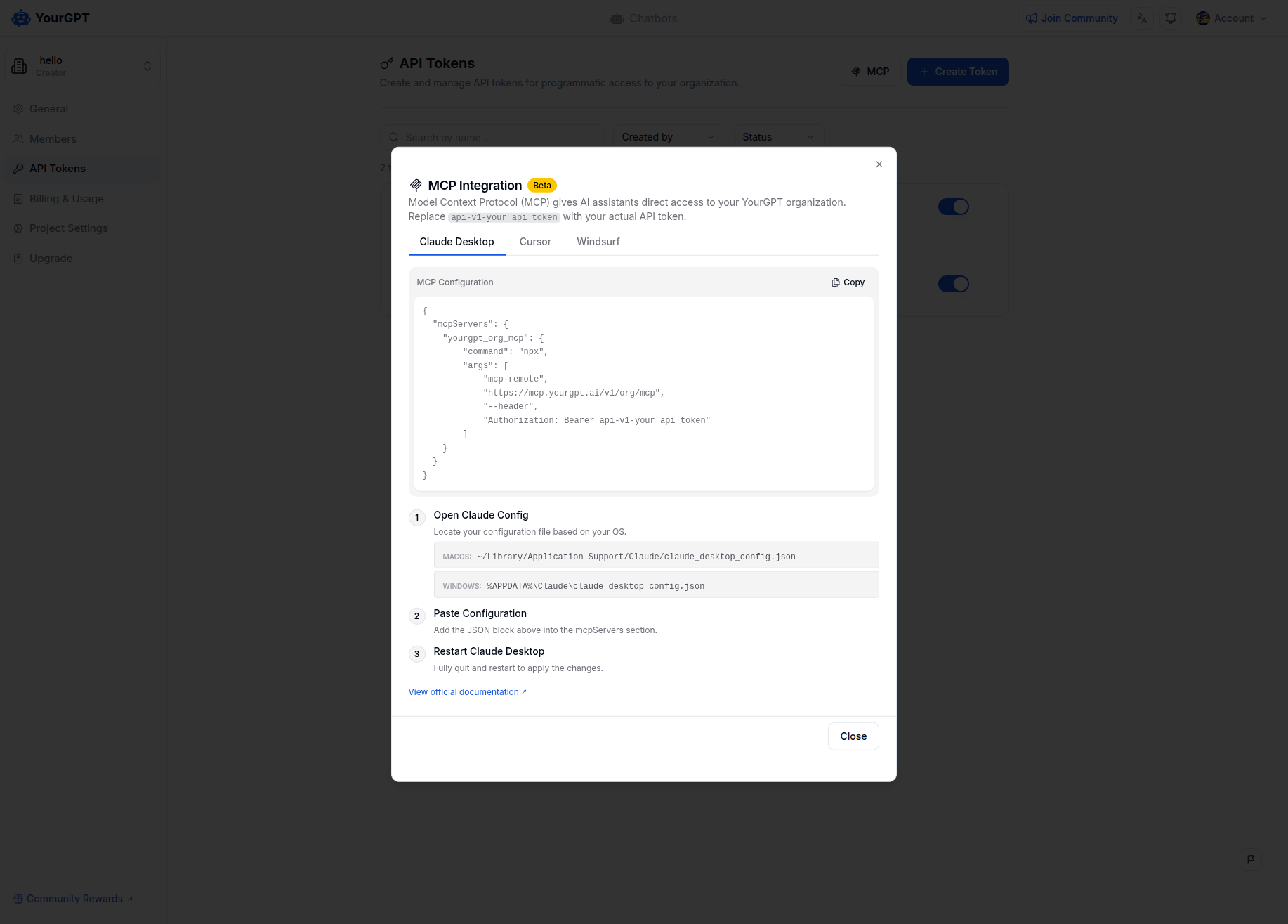 You can also use your API token to connect YourGPT with AI assistants like Claude Desktop via MCP (Model Context Protocol). Go to Settings > API Tokens and click MCP Setup to get the configuration.