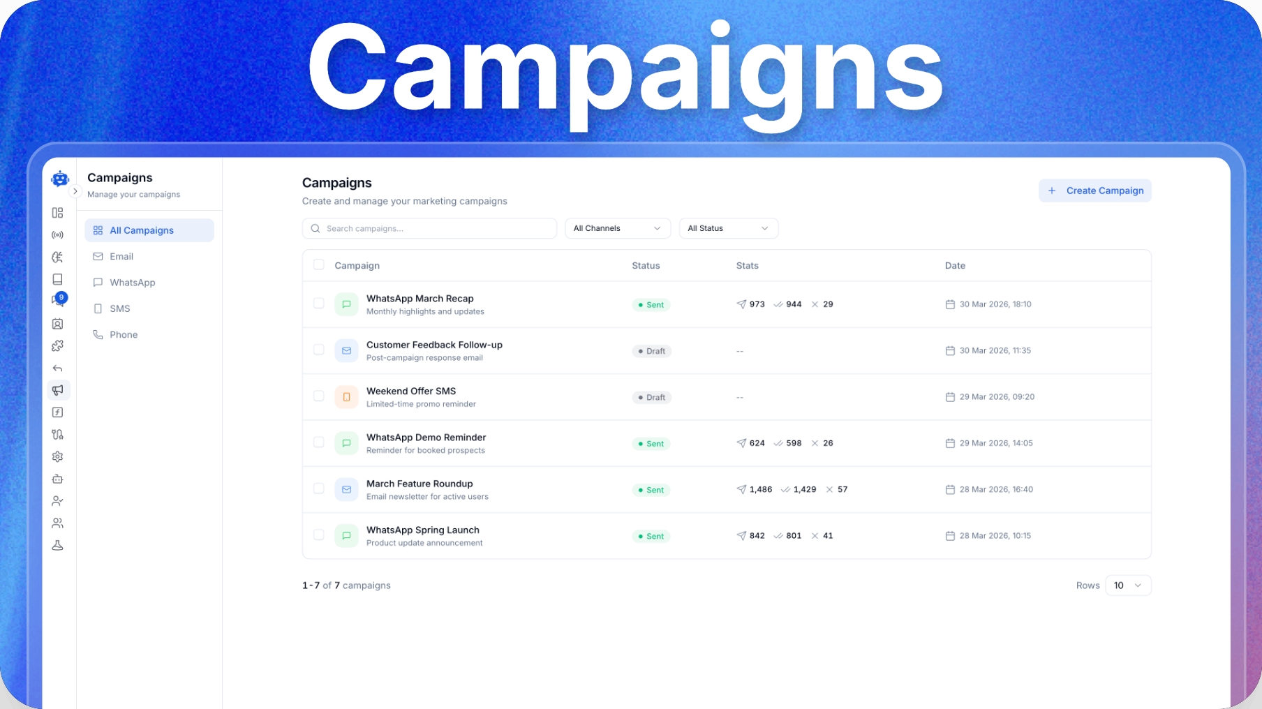 - Reach: Launch campaigns across WhatsApp, SMS, Email, and Phone with a single workflow.