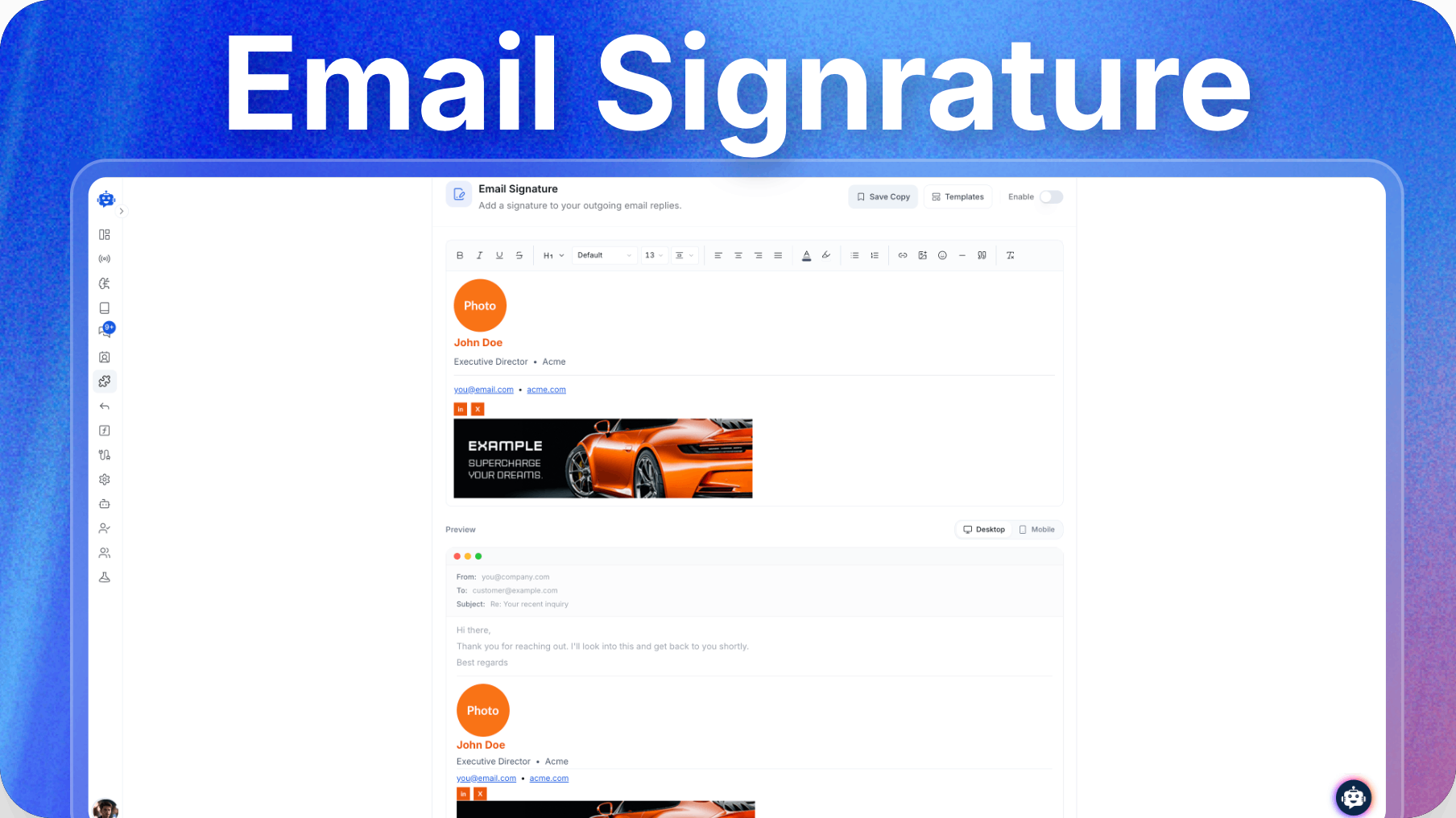 - Launched the new Email Signature Editor to standardize and professionalize outgoing communication. Teams can create branded signatures with rich text, profile details, social links, banners, and live preview support.